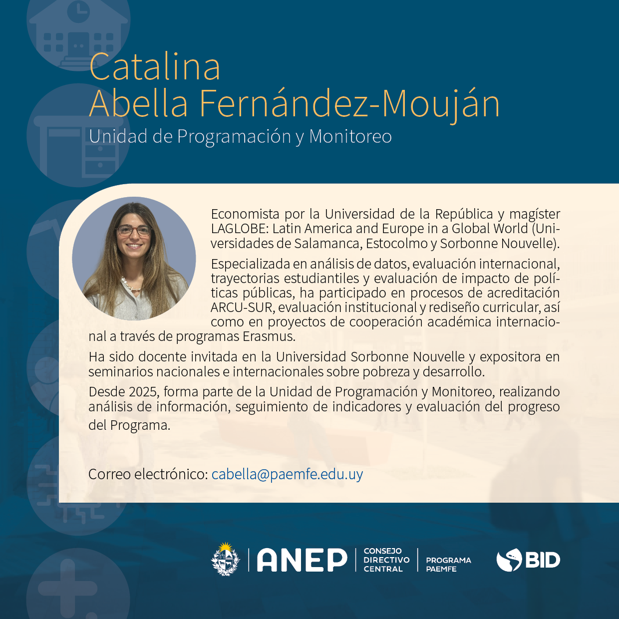 Nombre Unidad Vínculo Funcional Correo Personal Institucional Carlos Troncoso Coordinación General Personal contratado ctroncoso@anep.edu.uy John Suárez Secretaría Técnica y Operativa Personal contratado jsuarez@paemfe.edu.uy Alejandra Gil Secretaría Técnica y Operativa Personal dependiente agil@paemfe.edu.uy Leandro Tritten Secretaría Técnica y Operativa Personal dependiente ltritten@paemfe.edu.uy Verónica Plana Programación y Monitoreo Personal contratado vplana@paemfe.edu.uy Mariane Estellano Programación y Monitoreo Personal contratado mestellano@paemfe.edu.uy Carlos González Programación y Monitoreo Personal contratado cgonzalez@anep.edu.uy Mercedes Fernández Programación y Monitoreo Personal contratado mfernandez@paemfe.edu.uy Catalina Abella Programación y Monitoreo Personal contratado cabella@paemfe.edu.uy Alejandro Giovannini Financiero Contable Personal dependiente agiovannini@anep.edu.uy Marines Sena Financiero Contable Personal contratado msena@anep.edu.uy Martín Bruzzese Financiero Contable Personal dependiente mbruzzese@anep.edu.uy Natalia Stalla Financiero Contable Personal dependiente nstalla@anep.edu.uy Juan Porley Financiero Contable Personal dependiente jporley@anep.edu.uy Verónica Costa Financiero Contable Personal contratado vcosta@anep.edu.uy Raúl Nazar Financiero Contable Personal contratado rnazar@anep.edu.uy Pilar Rodríguez Contratación de RRHH Personal contratado pirodriguez@anep.edu.uy Camila Franchi Contratación de RRHH Personal dependiente cfranchi@paemfe.edu.uy María Eugenia Neme Jurídica y Adquisiciones Personal contratado mneme@paemfe.edu.uy Bernardo Ruiz Jurídica y Adquisiciones Personal contratado bruiz@paemfe.edu.uy Pablo Nova Jurídica y Adquisiciones Personal dependiente pnova@paemfe.edu.uy Fernando Rischewski Intraestructura Personal contratado frischewski@paemfe.edu.uy Leticia Balao Infraestructura Personal contratado lbalao@paemfe.edu.uy Virginia Rubio Infraestructura Personal contratado vrubio@paemfe.edu.uy Adriana Francese Infraestructura Personal contratado afrancese@paemfe.edu.uy Carlos Guido Infraestructura Personal contratado cguido@paemfe.edu.uy Rodrigo Sales Infraestructura Personal contratado rsales@paemfe.edu.uy Graciela Gadea Infraestructura Personal contratado ggadea@paemfe.edu.uy Roxana Antuña Infraestructura Personal contratado rantuna@paemfe.edu.uy Beatriz Tanca Infraestructura Personal contratado btanca@paemfe.edu.uy Paula Cardellino Infraestructura Personal contratado pcardellino@paemfe.edu.uy Esteban Alcarraz Infraestructura Personal contratado ealcarraz@paemfe.edu.uy Marina Campos Infraestructura Personal contratado mcampos@paemfe.edu.uy María del Pilar Muñoz Infraestructura Personal contratado mmunoz@paemfe.edu.uy Alberto Pierotti Infraestructura Personal contratado apierotti@paemfe.edu.uy Patricia Duarte Infraestructura Personal contratado pduarte@paemfe.edu.uy Sebastián Viera Infraestructura Personal contratado sviera@paemfe.edu.uy Federico De Souza Infraestructura Personal contratado gdesouza@paemfe.edu.uy Antonella Passaro Infraestructura Personal contratado apassaro@paemfe.edu.uy Luana Tabera Infraestructura Personal contratado ltabera@paemfe.edu.uy Nicolás López Infraestructura Personal contratado nlopez@paemfe.edu.uy Diego Bianchi Soporte Tecnológico Personal dependiente dbianchi@paemfe.edu.uy Eduardo de Nava Gestión de Depósito Personal contratado edenava@paemfe.edu.uy Luis Rosas Gestión de Depósito Personal dependiente deposito@paemfe.edu.uy Gastón Bariani Gestión de Depósito Personal dependiente deposito@paemfe.edu.uy Álvaro Martínez Gestión de Depósito Personal dependiente deposito@paemfe.edu.uy Julieta Rodríguez Gestión de Depósito Personal dependiente jrodriguez@paemfe.edu.uy Kaira Iglesias Gestión de Depósito Personal dependiente kiglesias@paemfe.edu.uy Walter Cardozo Gestión de Depósito Personal dependiente deposito@paemfe.edu.uy Sebastián Rodríguez Gestión de Depósito Personal dependiente deposito@paemfe.edu.uy