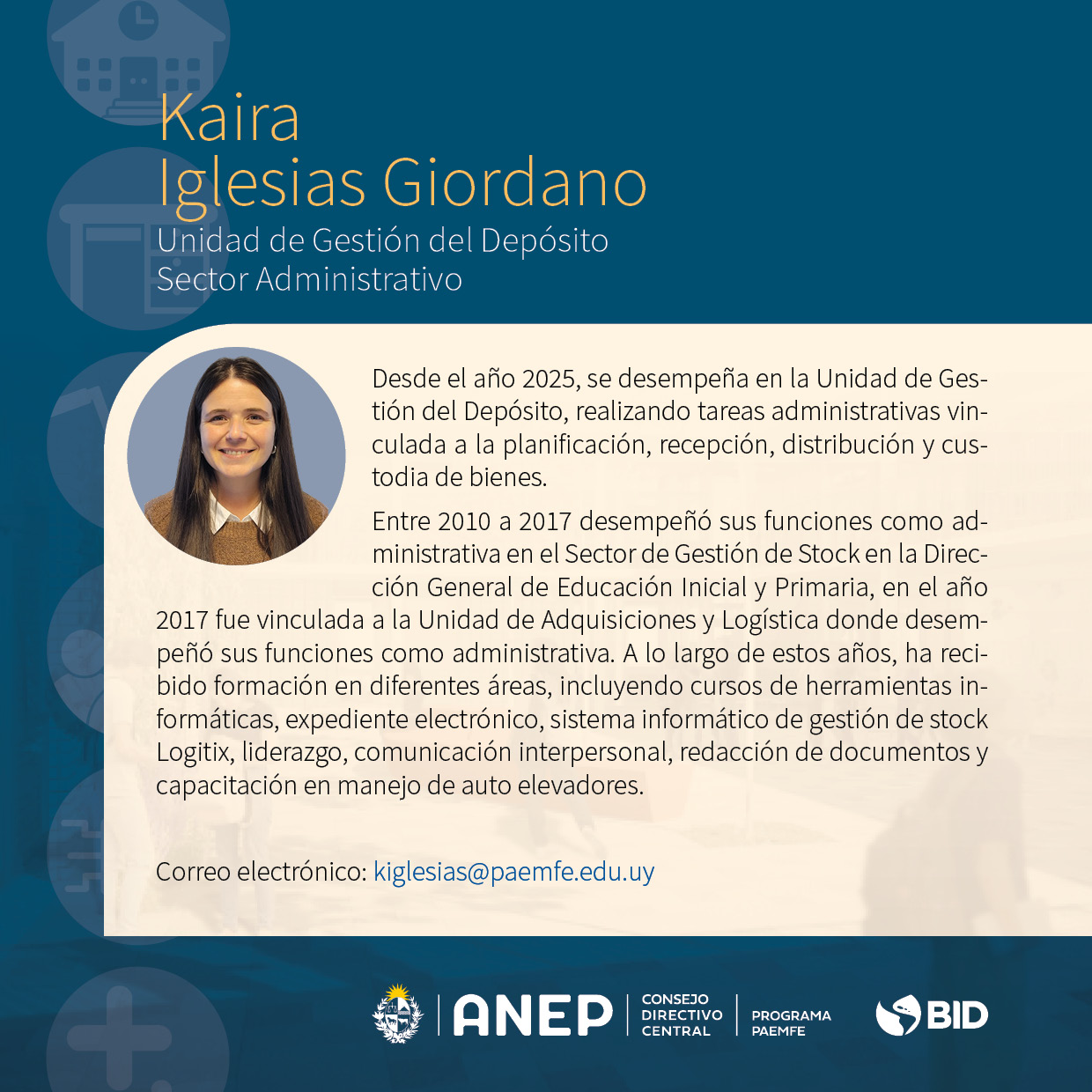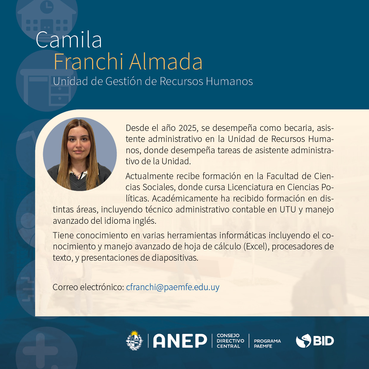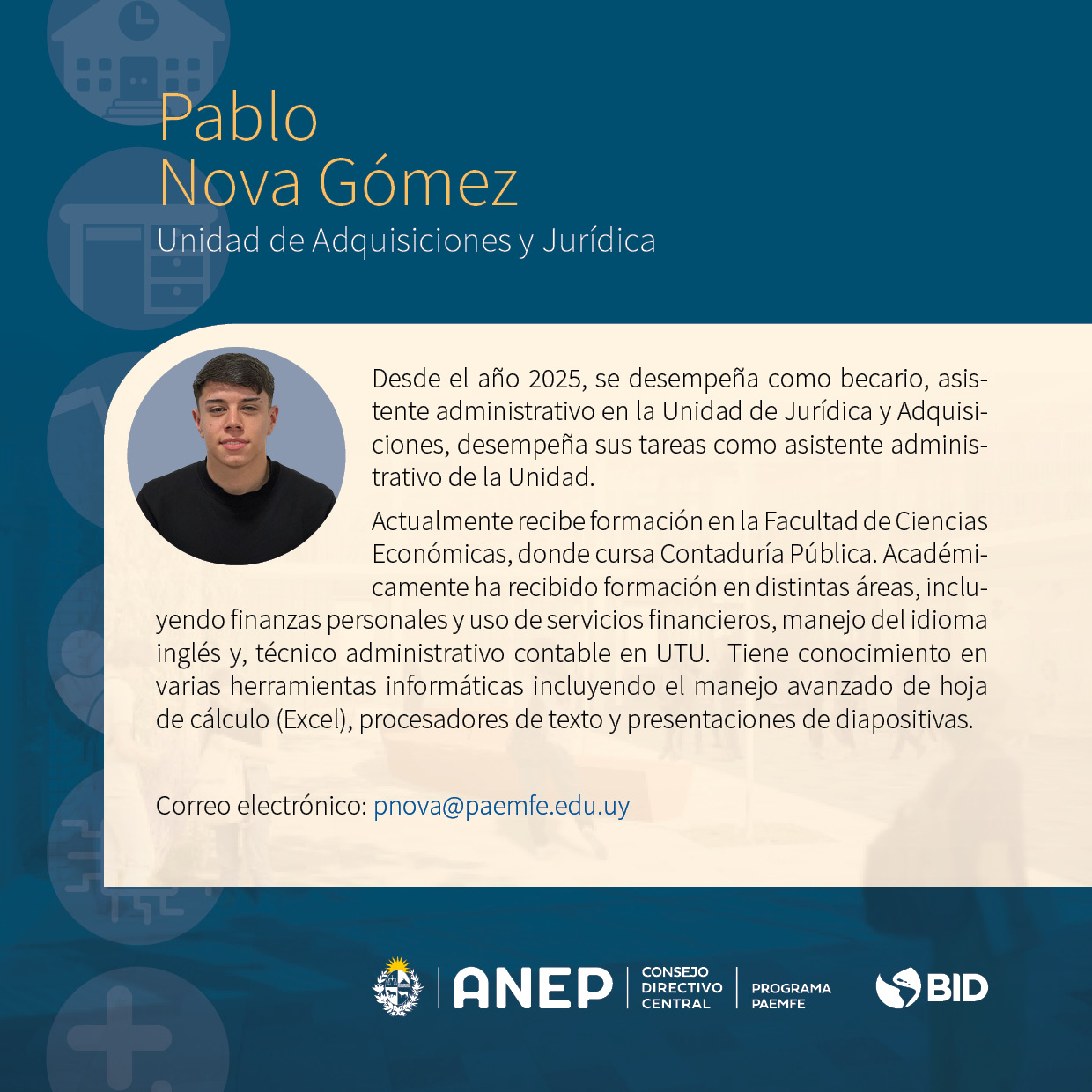 Nombre Unidad Vínculo Funcional Correo Personal Institucional Carlos Troncoso Coordinación General Personal contratado ctroncoso@anep.edu.uy John Suárez Secretaría Técnica y Operativa Personal contratado jsuarez@paemfe.edu.uy Alejandra Gil Secretaría Técnica y Operativa Personal dependiente agil@paemfe.edu.uy Leandro Tritten Secretaría Técnica y Operativa Personal dependiente ltritten@paemfe.edu.uy Verónica Plana Programación y Monitoreo Personal contratado vplana@paemfe.edu.uy Mariane Estellano Programación y Monitoreo Personal contratado mestellano@paemfe.edu.uy Carlos González Programación y Monitoreo Personal contratado cgonzalez@anep.edu.uy Mercedes Fernández Programación y Monitoreo Personal contratado mfernandez@paemfe.edu.uy Alejandro Giovannini Financiero Contable Personal dependiente agiovannini@anep.edu.uy Marines Sena Financiero Contable Personal contratado msena@anep.edu.uy Martín Bruzzese Financiero Contable Personal dependiente mbruzzese@anep.edu.uy Natalia Stalla Financiero Contable Personal dependiente nstalla@anep.edu.uy Juan Porley Financiero Contable Personal dependiente jporley@anep.edu.uy Verónica Costa Financiero Contable Personal contratado vcosta@anep.edu.uy Raúl Nazar Financiero Contable Personal contratado rnazar@anep.edu.uy Pilar Rodríguez Contratación de RRHH Personal contratado pirodriguez@anep.edu.uy Camila Franchi Contratación de RRHH Personal dependiente cfranchi@paemfe.edu.uy María Eugenia Neme Jurídica y Adquisiciones Personal contratado mneme@paemfe.edu.uy Bernardo Ruiz Jurídica y Adquisiciones Personal contratado bruiz@paemfe.edu.uy Pablo Nova Jurídica y Adquisiciones Personal dependiente pnova@paemfe.edu.uy Fernando Rischewski Intraestructura Personal contratado frischewski@paemfe.edu.uy Leticia Balao Infraestructura Personal contratado lbalao@paemfe.edu.uy Virginia Rubio Infraestructura Personal contratado vrubio@paemfe.edu.uy Adriana Francese Infraestructura Personal contratado afrancese@paemfe.edu.uy Carlos Guido Infraestructura Personal contratado cguido@paemfe.edu.uy Rodrigo Sales Infraestructura Personal contratado rsales@paemfe.edu.uy Graciela Gadea Infraestructura Personal contratado ggadea@paemfe.edu.uy Roxana Antuña Infraestructura Personal contratado rantuna@paemfe.edu.uy Beatriz Tanca Infraestructura Personal contratado btanca@paemfe.edu.uy Paula Cardellino Infraestructura Personal contratado pcardellino@paemfe.edu.uy Esteban Alcarraz Infraestructura Personal contratado ealcarraz@paemfe.edu.uy Marina Campos Infraestructura Personal contratado mcampos@paemfe.edu.uy María del Pilar Muñoz Infraestructura Personal contratado mmunoz@paemfe.edu.uy Alberto Pierotti Infraestructura Personal contratado apierotti@paemfe.edu.uy Patricia Duarte Infraestructura Personal contratado pduarte@paemfe.edu.uy Sebastián Viera Infraestructura Personal contratado sviera@paemfe.edu.uy Federico De Souza Infraestructura Personal contratado gdesouza@paemfe.edu.uy Antonella Passaro Infraestructura Personal contratado apassaro@paemfe.edu.uy Luana Tabera Infraestructura Personal contratado ltabera@paemfe.edu.uy Nicolás López Infraestructura Personal contratado nlopez@paemfe.edu.uy Diego Bianchi Soporte Tecnológico Personal dependiente dbianchi@paemfe.edu.uy Eduardo de Nava Gestión de Depósito Personal contratado edenava@paemfe.edu.uy Luis Rosas Gestión de Depósito Personal dependiente deposito@paemfe.edu.uy Gastón Bariani Gestión de Depósito Personal dependiente deposito@paemfe.edu.uy Álvaro Martínez Gestión de Depósito Personal dependiente deposito@paemfe.edu.uy Julieta Rodríguez Gestión de Depósito Personal dependiente jrodriguez@paemfe.edu.uy Kaira Iglesias Gestión de Depósito Personal dependiente kiglesias@paemfe.edu.uy Walter Cardozo Gestión de Depósito Personal dependiente deposito@paemfe.edu.uy Sebastián Rodríguez Gestión de Depósito Personal dependiente deposito@paemfe.edu.uy